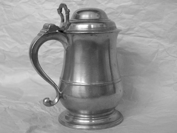 A clean quart marked pewter English export tulip-shape tankard by Robert Bush and Richard Perkins. Perkins was